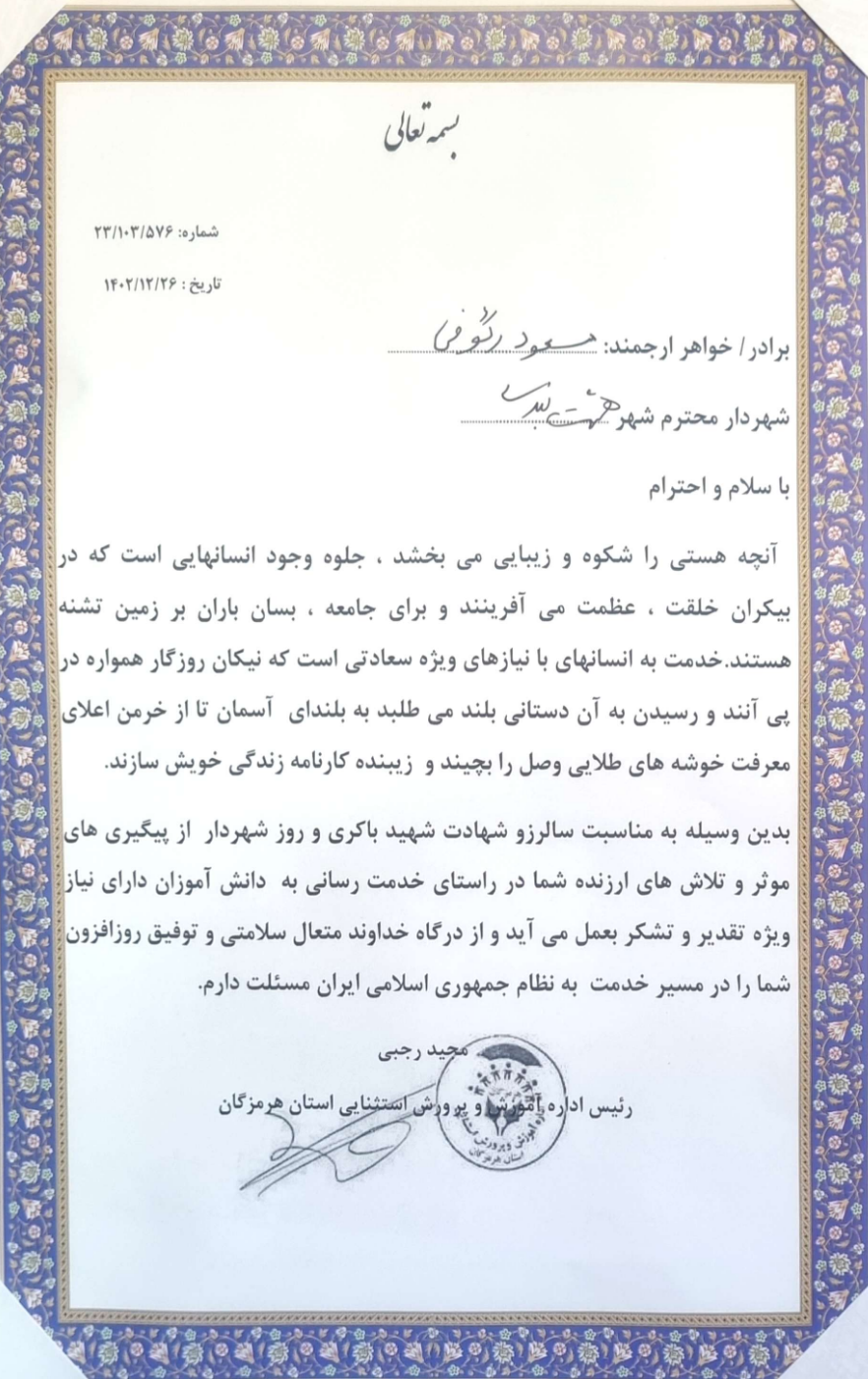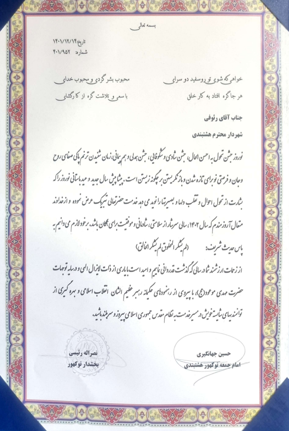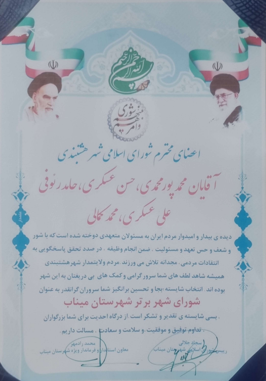 خداوند متعال را شاکریم که در این مدت توفیق خدمتگزاری به مردم ولایتمدار شهر هشتبندی در کنار اعضای محترم شورای اسلامی شهر و پرسنل زحمتکش و پرتلاش شهرداری را به ما عنایت فرموده تا به نیازها و خواسته های به حق شهروندان جهت ایجاد امنیت شهروندی ، حفظ منافع شهر ، ارائه خدمات گسترده و مطلوب بپردازیم و علی رغم کمبودها و مشکلات از هیچ تلاشی دریغ نخواهیم نمود و همواره تلاش می نماییم تا اقدامات شهرداری منطبق با خواسته های شهروندان محترم شهر هشتبندی باشد ، اگر چه می دانیم تا رسیدن به مرز ایده آل فاصله زیاد داریم ولی با تلاش و سرعت برای رسیدن به هدفمان که همان توسعه همه جانبه شهر می باشد دریغ نخواهیم ورزید.
